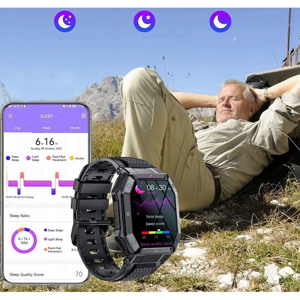 Zegarek wie, kiedy kładziesz się spać a kiedy wstajesz. Dzięki dedykowanej aplikacji możesz sprawdzić ile trał sen głęboki a ile płytki. W smartwatchu masz również wbudowaną funkcję budzika, dzięki czemu nie zaśpisz i nie spóźnisz się np. do pracy.